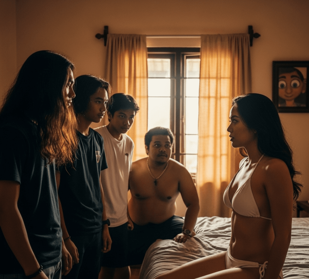 Aku mengedip-ngedipkan mata, biar pandanganku jelas. Wajah-wajah itu nggak asing bagiku. Dua di antaranya adalah pegawai kosku, Igun dan Cecep. Dan dua lagi adalah teman-temannya yang kutemui di bawah tadi. Apakah aku sanggup melayani empat orang sekaligus, mengingat seumur hidup aku selalu “bermain” satu lawan satu?